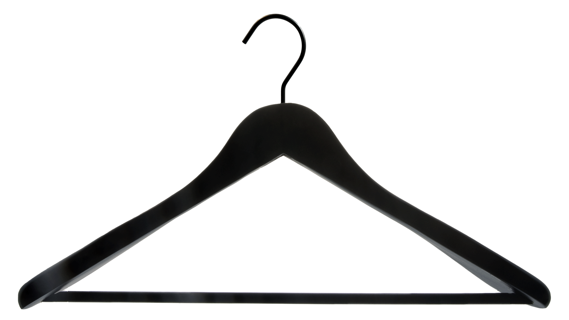 Buet trehenger med sort matt gummi-belegg, brede skuldre, stang og sort krok